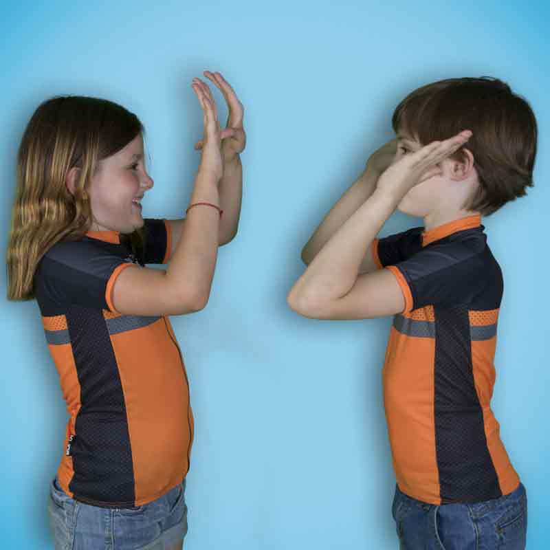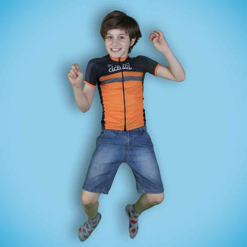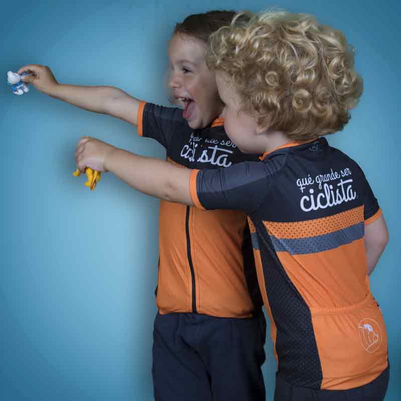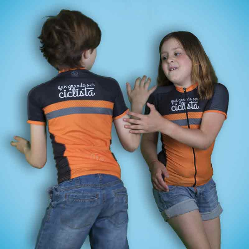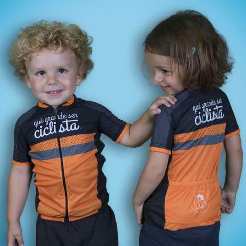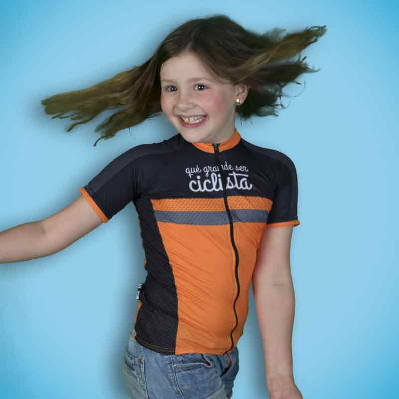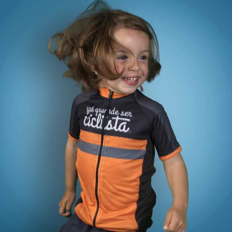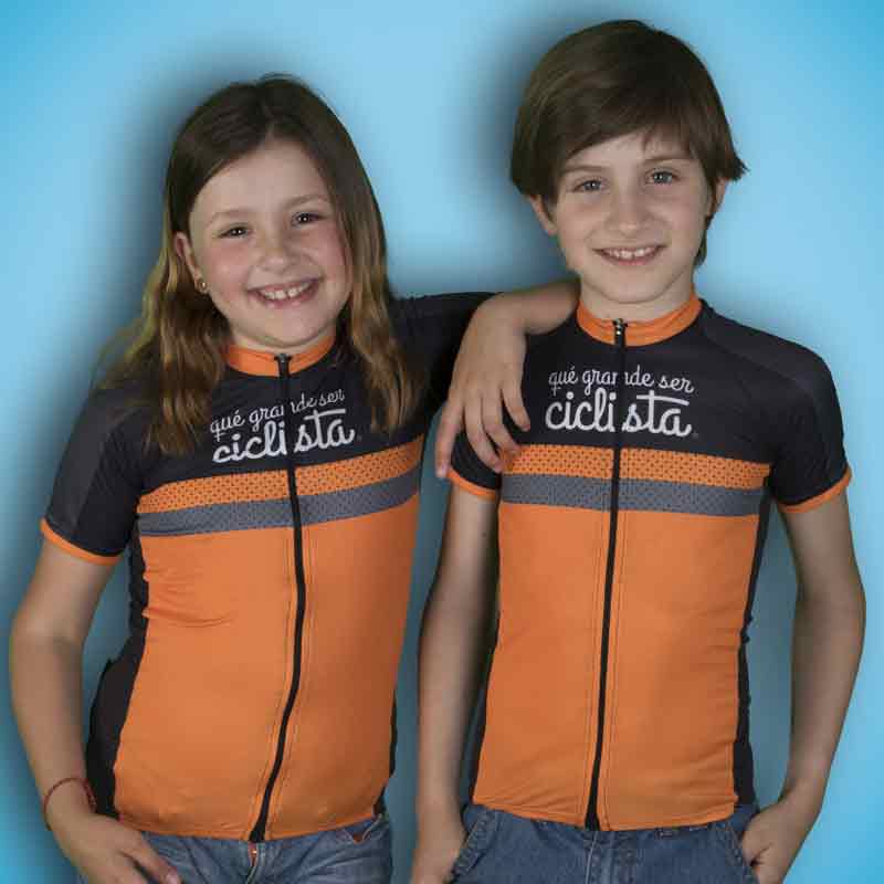 Maillot de ciclismo específico para niños confeccionado íntegramente en España. Lleva cremallera completa con dos bolsillos traseros. Gracias a su lycra de poliéster 100% y multifilamento de 90 gramos es transpirable y muy cómodo.